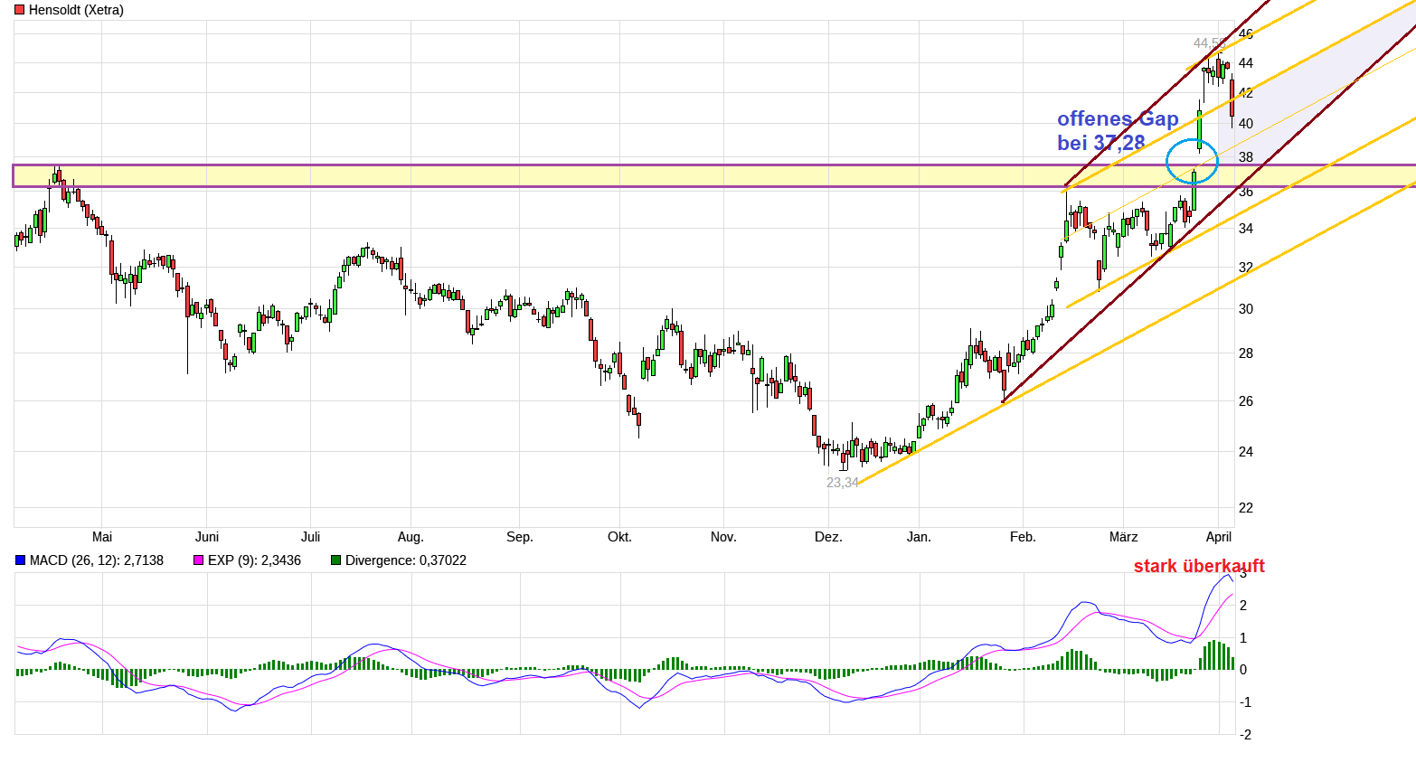 Aus charttechnischer Sicht gäbe es z.B. noch ein offenes Gap bei 37,28€. Das wäre u.U. ein denkbarer Anlaufpunkt, falls sich die Konsoliderung etwas stärker ausweiten würde. Man ist ja aktuell bereits nahe der 40er Marke. Wäre also keine so große Entfernung bis dahin. Allerdings muß man auch parallel immer schauen was geopolitisch immer passiert. Denn diese Modebranche mit dem Thema "sich eine goldene Nase mit Krieg verdienen" reagiert natürlich, falls diesbezüglich relevante Dinge sich entschärfen / verschärfen.
