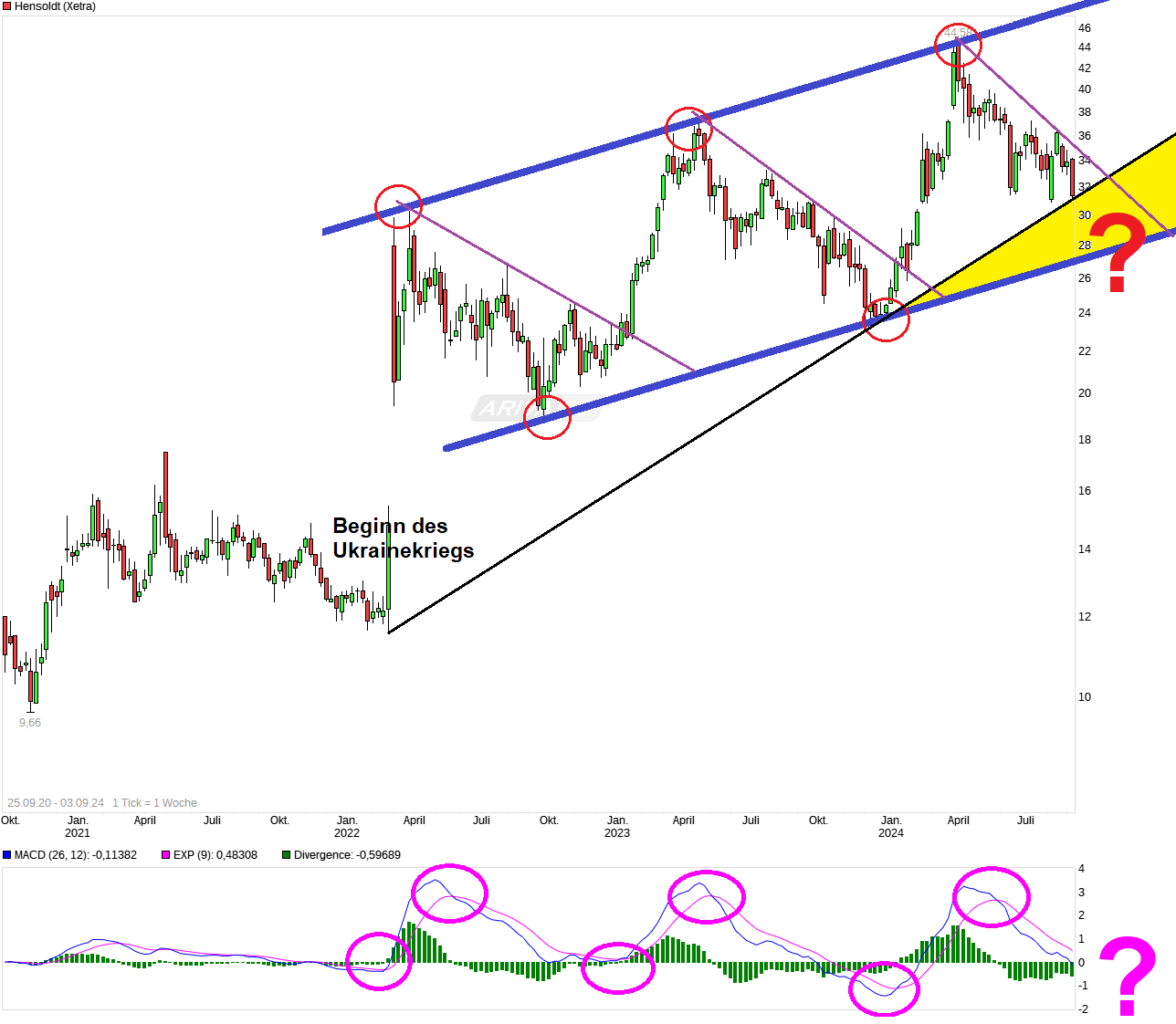 Hensoldt hatte seit Februar 2022 lange Zeit deutlich von anziehenden Verteidigungs-Etats profitiert. Kurz vor dem russischen Überfall auf die Ukraine wurden die Aktien noch zu etwa 12 Euro gehandelt und waren seither bis auf das Rekordniveau von 44,58 Euro hochgeschnellt. Dieses stammte von Anfang April. Doch seither hatte die Aktie wieder bis zu 38 Prozent verloren.