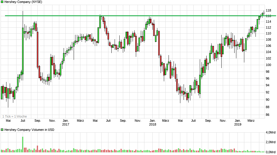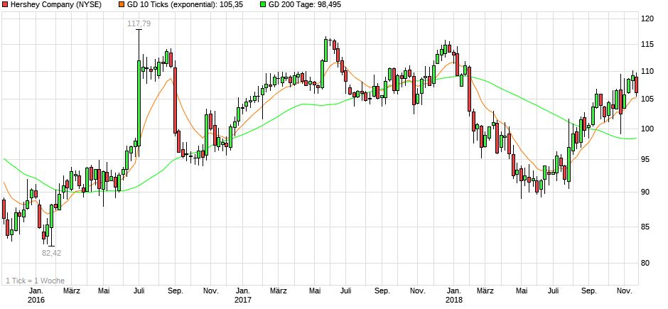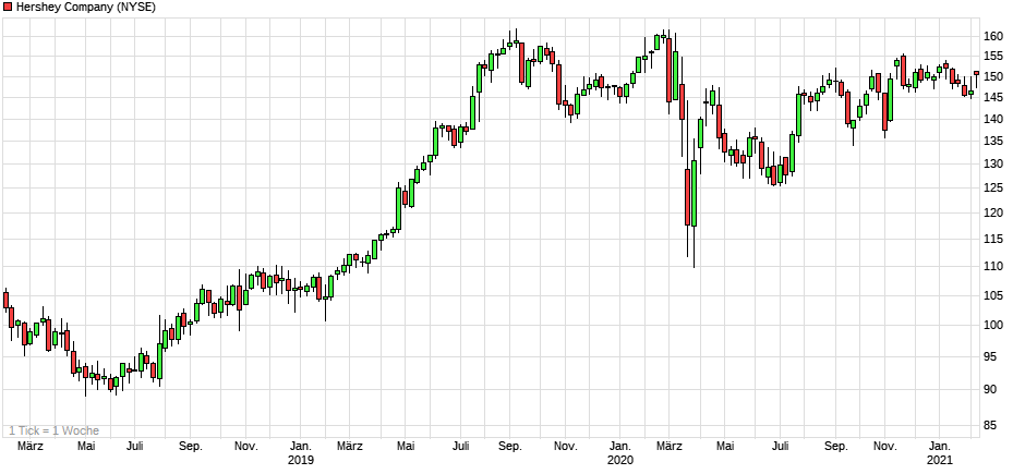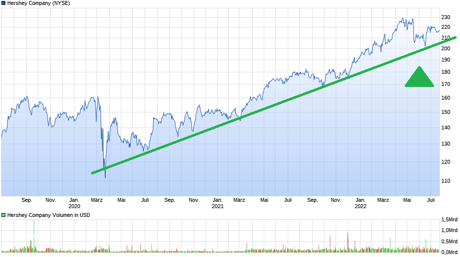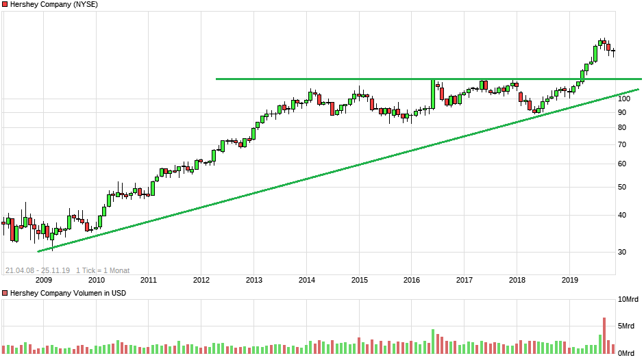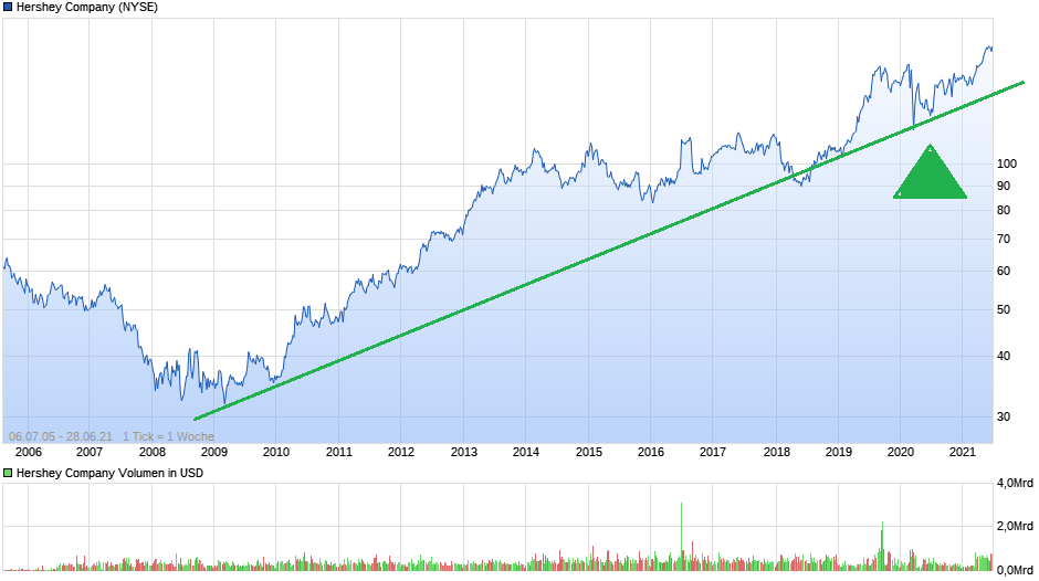 The Hershey Co. ist ein führender, US-amerikanischer, Hersteller Süßwarenprodukten und kann bereits auf eine 125-jährige Erfolgsgeschichte zurückblicken. Ursprünglich wurde das Unternehmen mit dem Ziel gegründet, jedem Menschen auf der Welt qualitativ hochwertige und dennoch erschwingliche Schokolade anzubieten. Und so zählt Schokolade bzw. Schokoladenprodukte noch heute zu den Kernkompetenzen des Konzerns. Zu den bekanntesten Marken zählen Namen wie: Kisses, Reeses, KitKat, Payday oder Hersheys. Daneben bietet der Süßwarenexperte auch weitere Snacks, wie Popcorn oder Natchos an.