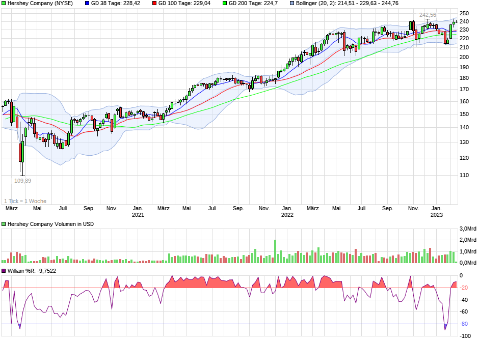 Trotz des krisenfesten Geschäftsmodells blieb auch die Aktie von The Hershey nicht von der panischen Börsenstimmung verschont und notiert aktuell 11,69 % unter ihren Höchstständen. Im Vergleich zum Dow Jones und S&P 500 beweist die Aktie damit dennoch klare, relative Stärke. Solange die psychologisch wichtige 200 $ Marke nicht nach unten verlassen wird, bleibt eine Kurserholung weiterhin das wahrscheinlichere Szenario. Auch der "The Big Call-Check Score" von 97,7 % unterstreicht diese Annahme und somit bietet sich die Aktie auf dem aktuellen Kursniveau für eine langfristige Call-Spekulation an.