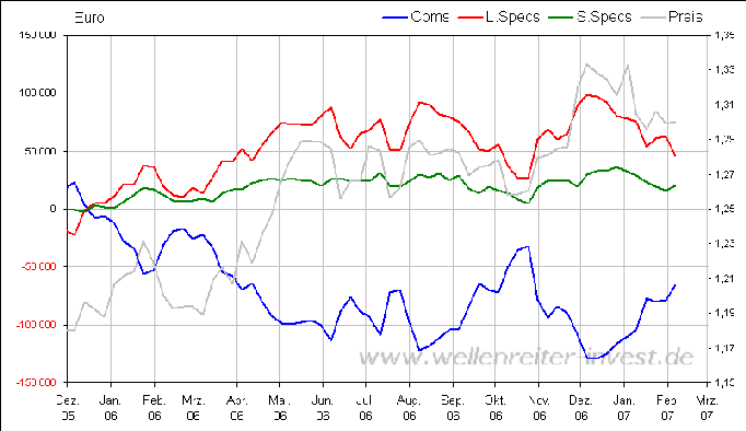 Der Gegenposition der Hedgefonds (auch "large Specs" genannt) bei den Future-Geschäften nehmen die Commercials ("Coms") ein (Chart unten). Bei Dollar- und Öl-Futures sind das z. B. Firmen wie Volkswagen, Porsche oder Lufthansa, die sich einen bestimmten Dollar- oder Kerosin-Kurs mit Futures "sichern" wollen. Die Interessen beider Gruppen sind gegenläufig. Hedgefonds setzen als Trendfolger auf charttechnische Fortsetzungen von Uptrends, während Commercials mit ihren Absicherungsgeschäften ein "reversal to the mean" im Auge haben.