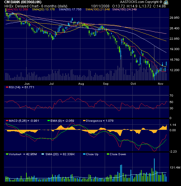 China Merchants Bank shares were last up 1.20 Hong Kong dollars or 3 percent at 40.00 dollars, off a fresh record of 40.15 dollars.