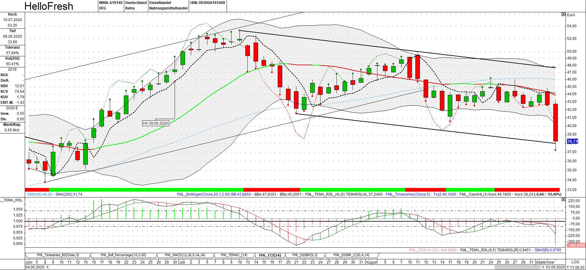 Ist ja das Lieblingsthema mancher Chartanalysten. Wichtig ist nur, dass man später bis zum Zeitpunkt der Keilspitze wieder über die untere Linie des Keils vorstößt. Das kann sich aber noch zeitlich hinziehen. Könnte also durchaus noch ein paar Tage sogar bis etwa 33,5-34,0 € runter gehen. Selbst dann könnte es noch bullish sein, wenn man dann in den nächsten Wochen wieder über die untere Keilgrenze geht. Ich glaub, die dürfte irgendwo bei glatt 40 € liegen.