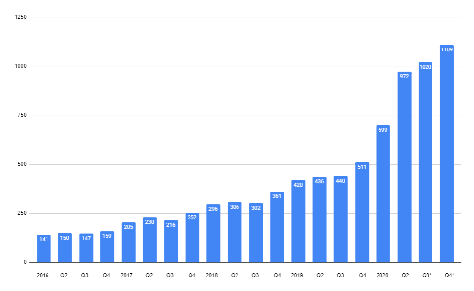 - Webseitenaufrufe (in Millionen) korrelieren mit Anzahl der Kunden, was meist auch mit Umsatz Hand in Hand geht. Gibt aber durchaus Abweichungen wie im Q2 als die Zahl der Kunden in den USA deutlich gesunken (von 2,64 auf 1,98 Millionen) aber der Umsatz gleichzeitig gestiegen ist durch mehr Bestellungen und höheren Warenkorb.