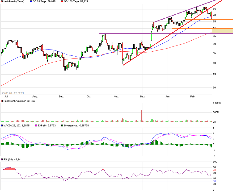 Bei einem Kurs von 57,5 € hätte Hellofresh eine MarketCap von 10,0 Mrd € oder KUV von knapp 2,0. Rechnet man den Nettocash noch ab, wäre es ein 1,9 bei dann wohl etwa KGV von 22. Das klingt heutzutage megagünstig. Und da uns niedrige Zinsen noch länger begleitet werden, egal ob die Inflation etwas auf 2-3% anzieht, würde ich in dem bereich auch stark kaufen. Aber ich würde mich nie dazu hinreissen lassen zu behaupten, man könne vom jetzigen Niveau nicht noch 10% fallen. So wahnsinnig günstig ist hF nn eben auch wieder nicht. Dennoch hoffe ich mal, dass man auch im Hinblick auf die mögliche DAX-Aufnahme spätestens im September wieder nach oben bewegen wird. Die 77-78 € sehen wir mit großer Wahrscheinlichkeit im Herbst wieder, wenn nicht früher. Umso schöner wenn wir die nächsten tage noch zu 60 € oder gar zu 57-58 € kaufen könnten.
