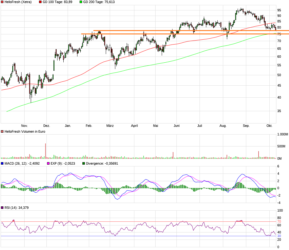 Technisch jetzt natürlich ne interessante Zone. Könnte jetzt bei 78 € wieder hoch drehen, aber vielleicht doch noch den Bereich 75-76 € mit nächster horizontaler Unterstützung und 200TL testen. Wenn es unter 75 € geht, müsste man sich echt Sorgen machen. Aber ich glaube das passiert nur, wenn wir tatsächlich noch den Herbst-Crash an den Märkten bekommen sollten, womit ich nicht wirklich rechne. Denn bei allen Problemen, die es derzeit weltweit in Sachen Lieferengpässe, Inflation geben sollte, ist erstens nicht jedes Unternehmen dasvon gleich betroffen, und zweitens sollte das ein temporäres Problem sein. Mal ganz davon abgesehen, dass wir übergeordnet trotzdem weiter ein sehr niedriges Zinsniveau und Anlagenotstand haben. Das Geld wird früher oder später wiefder in die Aktien zurückfließen.