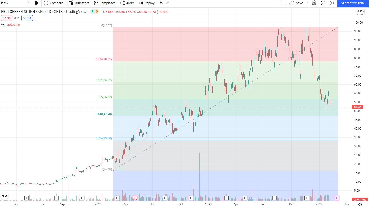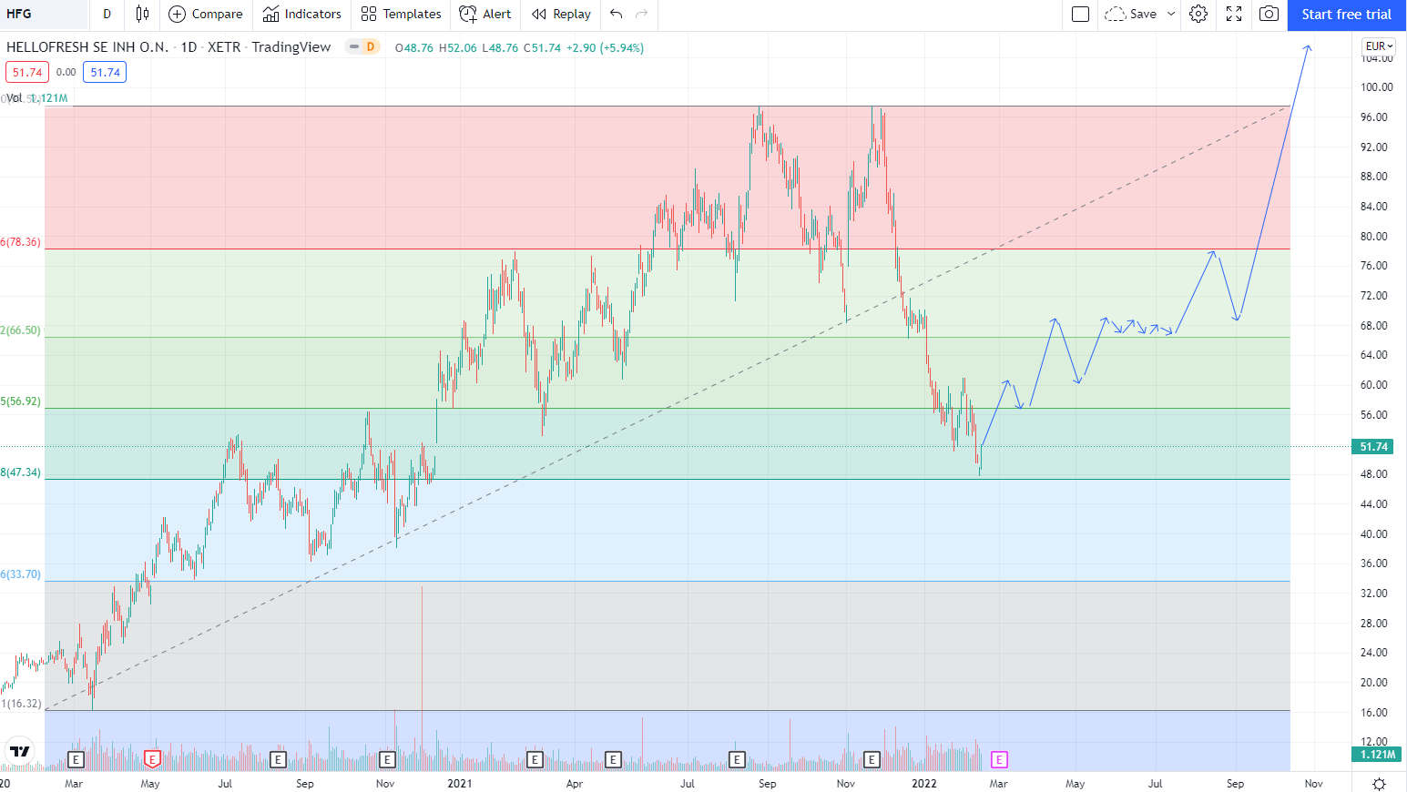 Nimmt man 04/2020 als Beginn einer anderthalbjährigen Aufwärtsbewegung, wären wir heute am Fibonacci 61,8 angekommen. Das muss halten.