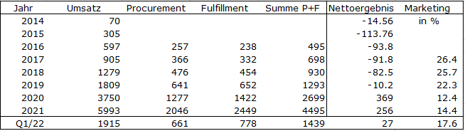 Was mich positivst stimmt sind die Bestellungen. 4 Bestellungen pro Kunde pro Quartal ist mega. Man darf nicht vergessen, dass da die ganzen looser-auspropier-gutschein-kunden mit einberechnet sind. Bedeutet, dass der Dauerkunde vermutlich geschätzte 6 Bestellungen pro Quartal macht, also jede zweite Woche. Das wäre extrem stark, weil für diese Kunden brauche ich zukünftig deutlich weniger Marketing. Viele Dauerkunden werden auch wirklich dauerhaft dabei bleiben, weil das Produkt/Dienstleistung stark und günstig ist. Die Zahlen für International finde ich übrigens nicht so schlecht ….