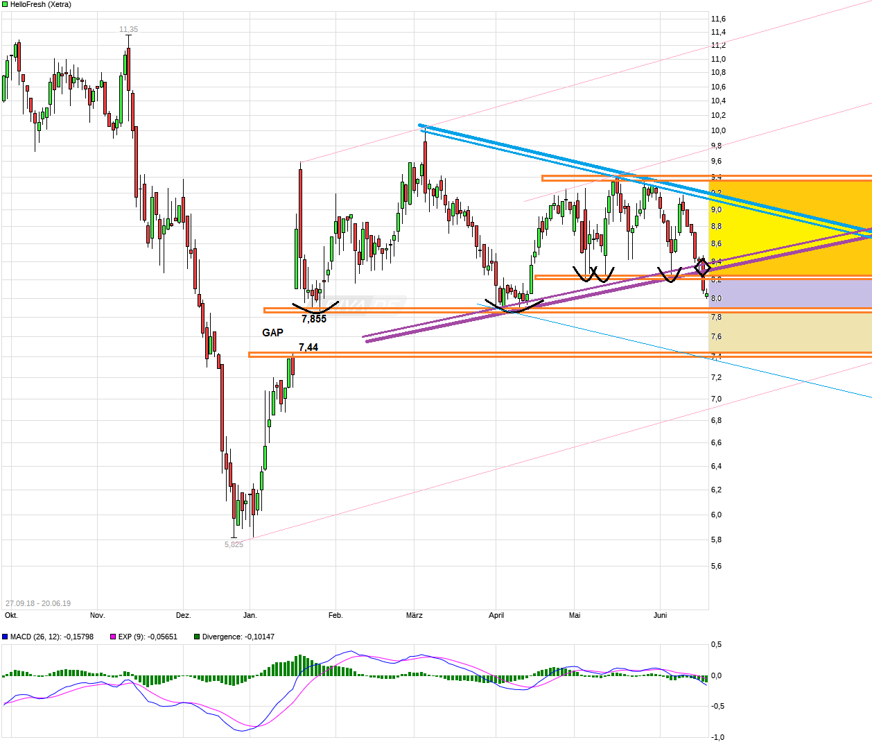 Mit dem Break der Marke um 8,20 hat man jetzt eine mehrfache Unterstützung gebrochen bzw. den neutralen Bereich der Vormate von 9,40-8,20 verlassen. Ob der nun erneut scharfe Rücksetzer im Zusammenhang mit dem großen Verfallstag morgen steht oder ob hier LV oder weitere Altaktionäre weiter auf der Abgabeseite bleiben, wird man dann u.U. nächste Woche vielleicht besser sehen können. Am Gesamtmarkt kann es weniger liegen, denn der ist die letzten Tage bombenfest. Unterhalb der 8,20 bleibt die Marke um 7,85/90 eine wichtige Unterstützung. Sollte sie auch brechen, dann würde man in das offene Gap vordringen, dessen Unterkante bei 7,44 liegt. Von daher interessant zu beobachten, ob man das Gap erneut weiter unangetastet läßt ( wie Anfang April) oder nicht. Rocket Internet hatte zuletzt sein großes Paket für 8€ (unter dem eigentlichen Marktkurs von damals) rasant geworfen, d.h. deutlich auch unter dem IPO Kurs von damals. Könnte man vielleicht auch so interpretieren, daß RI als langjähriger Insider scheinbar erstmal wenig Aussichten sah, daß hier in absehbarer Zeit viel an Kurssteigerung nochmal kommen würde und die Risiken für Rücksetzer nicht gering sind. Denn so schnell hätte RI den Cash aus dem Verkauf ja nicht gebraucht für neue Invesmtents, da der RI Cashberg auch so bereits enorm war. Vielleicht sieht das auch einer von den anderen Altaktionären jetzt so und baut seinen Bestand auch ab. Vielleicht nicht außerbörslich als Paket, sondern scheibchenweise über den normalen Markt? Wer vor dem IPO früh rein ist in den diversen Finanzierungsrunden, der kommt auch beim aktuellen Kurs wohl noch auf seinen Schnitt. Da das RI-Paket zu 8€ Käufer gefunden hatte, könnte das vielleicht auch eine kleine psychologische Stützmarke sein, die aber rein technisch gesehen nicht von sonderlicher Relevanz wäre. Lassen wir uns überraschen.