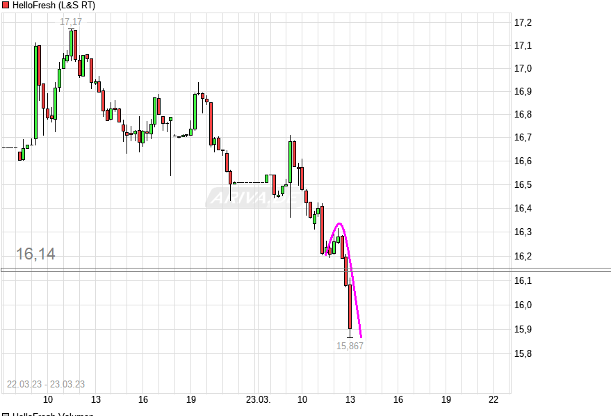 Scheint als hätte mancher Marktteilnehmer das so gesehen. Nach 12:30 ging es fix südwärts und auch wieder unter die 16,14. Wobei ja eigentlich schon seit gestern mit erreichen der 17er Zone die Verkaufswelle schon wieder rollt.