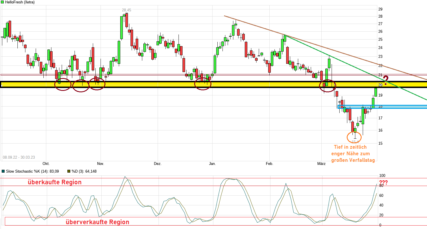 Also da war ja "zufällig" auch großer Verfallstag mit dem Optionsverfall der Aktien. Und genau in der zeitlichen Nähe wurde die Tiefregion bei HF erreicht und nach dem Verfallstag ging es dann wieder hoch mit wenig Gegenwehr. War ja bei vielen Aktien so, daß hier zum Verfallstag durch Schieflage vieler Akteure es dann sehr hektisch zuging. War also bei HF eher terminbedingt und weniger "Furcht" die Ursache. Vielleicht auch gezieltes Kursdrücken von großen Händen mit großen Put Beständen, die einen möglichst tiefen Kurs wollten zum Verfall und da natürlich mit dem Break der 16,14 dies erreichten. Natürlich sind hier viele Trader/Zocker immer unterweg mit kurzem Zeithorizont Da wechselt man schnell die Seiten, wenn die Zeichen wieder andersum mehr Gewinn versprechen, so z.B. jüngst bei der Rückkehr über die 16,14. Von daher mal schauen, ob das jetzt in der Region um 20€ auch wieder passiert, daß viele dieser Swingtrader dann auch fix wieder verkaufen in Erwartung man scheitert nach diesem großen schnellen Schluck aus der Kurspulle an dieser dickeren Widerstandszone oder wenn die überkaufte Stochastik wieder nach unten dreht. Da wäre dann wichtig beim Rücksetzer möglichst nicht wieder unter die Region um 18€ zu laufen. Warten wir es mal ab. Aktuell ist der Gesamtmarkt in sorgloser Feierlaune (DAX wieder kurz vor dem bisherigen Jahreshöchstand) und hochbewertete Techs laufen vorne weg. Allerdings ist auch Quartalsende vor der Tür und da gibt es auch vielleicht auf den letzten Metern noch etwas Window-Dressing.