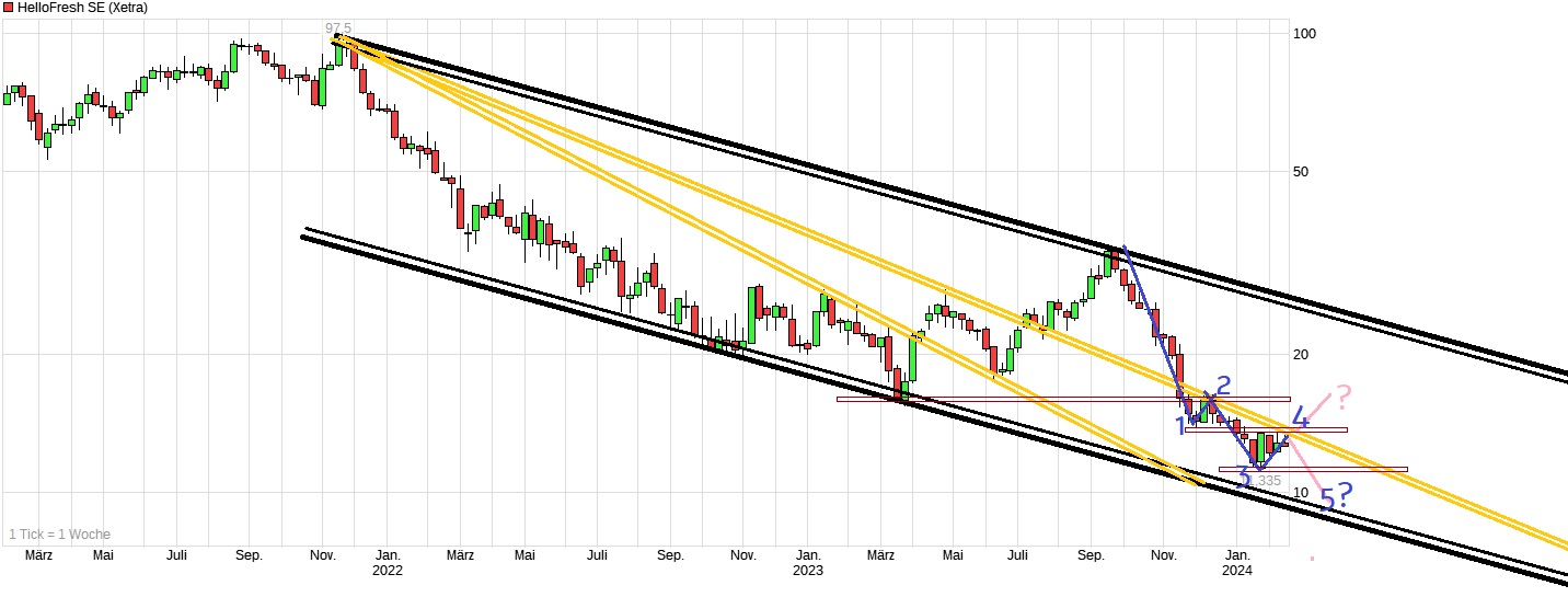 Hellofresh befindet sich weiter in einer völlig intakten Abwärtsbewegung. Es stellt sich jetzt die Frage, ob man sich aktuell in einer Welle 5 nach unten befindet nachdem der Kurs klar daran gescheitert ist die harte Widerstandsregion um 13,90/14,00 nach oben zu durchbrechen (was der Abschluß einer Welle 4 sein könnte). Würde die Welle 5 laufen, dann wäre mit Kursen unter 10€ zu rechnen. Die nächsten ausführlichen Zahlen und Prognosen gibt es erst am 15.3. , wo zugleich auch großer Verfallstag ist. Es wäre wenig überraschend, wenn sich bis dahin der Kurs eher weiter in "Kellerregionen" bewegen würde, falls es keinen außerordentlichen Grund geben sollte warum die LV im größeren Maßen aus dem Wert "fliehen" sollten.
