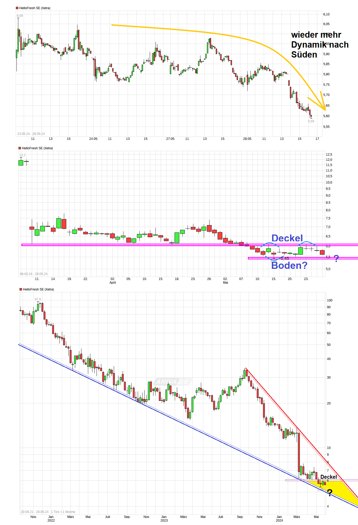 - HF gab Angang 2023 als Ziel aus, im Procurement und Fulfilment 2-3pp besser zu werden. Im Marketing 1-2pp. Im Marketing wurde aber im Q1 2024 mehr Geld ausgegeben als im Vorjahr. Letzteres ist somit nicht eingetreten. Man wird sicherlich auch in Zukunft für Marketing viel Geld ausgeben, um die Kundenbasis zu halten bzw. zu erweitern. In diesem Jahr hat man aber die Marketingausgaben eher auf Werbung anstatt auf Rabattaktionen verwendet. Hoffentlich trägt das Früchte. Ich gehe aber davon aus, dass man nur im RTE-Geschäft wachsen wird. In meiner Annahme 2024 um etwa 45% ggü. 2023 (in Q1 2024 wuchs man 54% ggü. Q1 2023). In 2025 und 2026 sehe ich nur einen inflationierten Umsatzanstieg bei den Mealkits und ein leichtes reales Wachstum bei RTE.