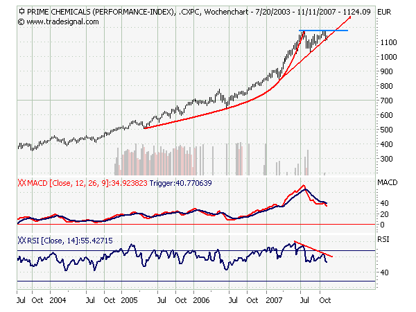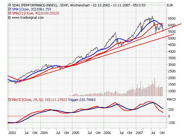 Wirft man aber mal einen Blick auf die übrigen Indizes der Deutschen Börse, insbesondere den MDAX, den SDAX und die Prime Branchenindizes, erkennt man, dass längst nicht mehr alles Gold ist, was glänzt. Inbesondere der absolute Highflyer seit März 2003, der SDAX, schwächelt seit der Jahresmitte deutlich und ist nun an einem kritischen Punkt angelangt: Die sekundäre Aufwärtstrendgerade seit August 2004 wurde auf Wochenschlussbasis leicht unterschritten.