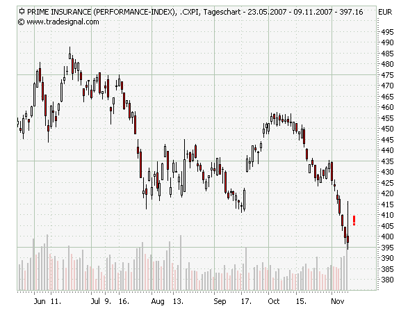 Die sog. Subprime Hypothekenkrise, die noch längst nicht ausgestanden ist, hat fast alle Bereiche der Kreditwirtschaft infiziert. Zunächst waren nur die Hypotheken auf private Immobilien betroffen, nun sind zunehmend auch die auf gewerbliche Immobilien, Commercial Papers und gar Credit Default Swaps (CDS) tangiert. Über den Kreditausfallversicherern schwebt ein Damoklesschwert. Die größten mit globaler Bedeutung - im SPX gelistet - sind AMBAC (ABK), MGIC (MTG) und MBIA (MBI), die u.a. Unternehmens- und Kommunalkredite versichern. Schau dir mal deren Charts an! Keines dieser Unternehmen verfügt über genügend Reserven, um weitere höhere Kreditausfälle zu schultern.