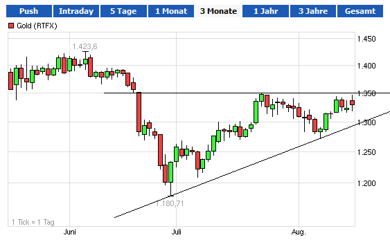 Aber über welche Umwege! Heut zunächst 25 Dollar runter, so dass man glaubt, die "neue Goldhype" hat nunmehr ihr Ende gefunden. Und dann noch am gleichen Tag wieder mehr als 40 Dollar hoch. Wer hat solche Verläufe schon auf seine Rechnung stehen?