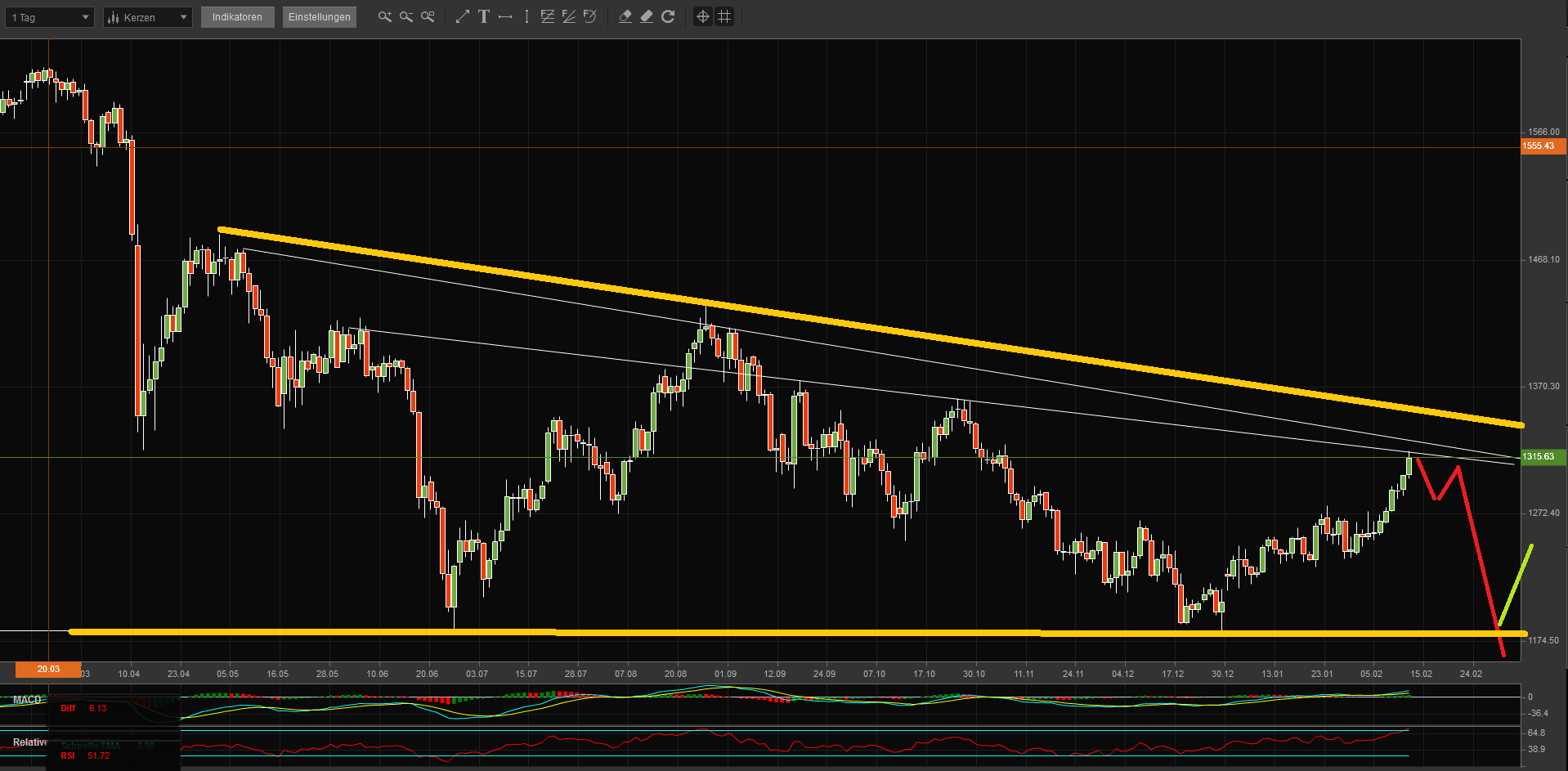 - steiler Aufwärtstrendkanal seit Ende Januar. Hält dieser, so kann man i. V. m. der horizontalen Unterstützung bei 1.350 ein Kursziel eben in dieser Größenordnung abgeleitet werden;