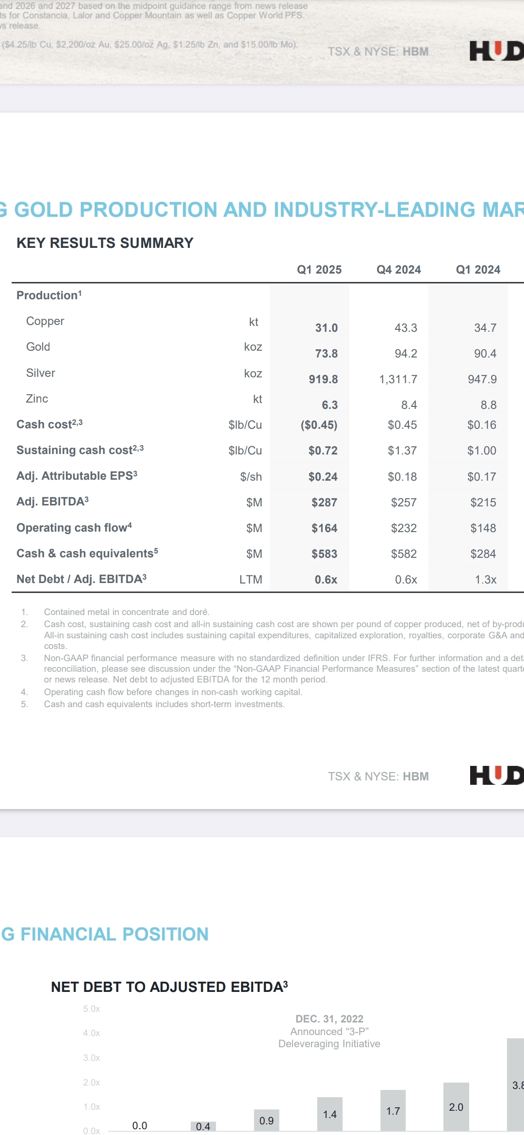 Cash and cash equivalents increased by $34.6 million to $284.4 million during the first quarter due to strong operating cash flows bolstered by higher copper and gold prices and sales volumes enabling a $43.5 million reduction in net debti during the quarter.