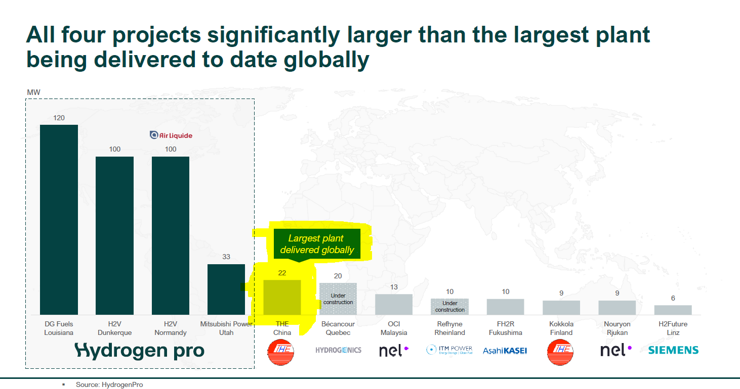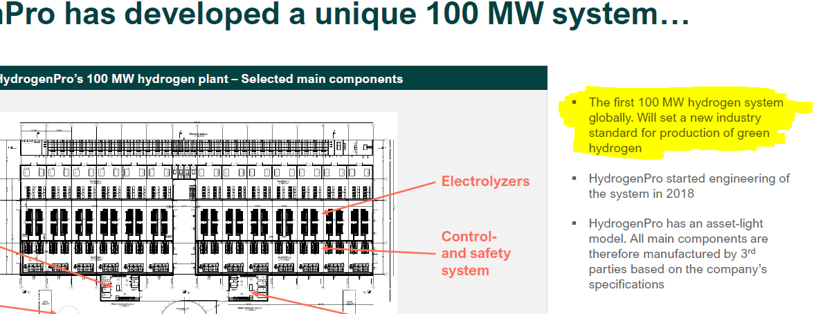 Bemerkenswert ist, dass HYPRO Elektrolyseure offenbar erheblich energieeffizienter sind als die Konkurrenz. Ebenfalls sind bei ITM Power Skaleneffekte zu sehen, die mit hoher Warscheinlichkeit auch auf HYPRO zutreffen (Energieeffizienz). Das wäre ein Ansatz um zu erklären, warum nicht ITM Power oder Nel Asa die Aufträge, die HYPRO ergattert hat, kriegen konnten.