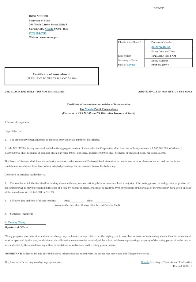 Artikel VIERTE wird geändert, so dass die Gesamtzahl der Aktien, die die Gesellschaft befugt ist auszustellen beträgt 1005000000, die (i) eine Milliarde sind Stammaktien, Nennwert $ 0,001 pro Aktie, und (ii) 5.000.000 sind Vorzugsaktien, Nennwert $ 0,001.