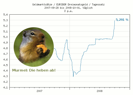 Die Liquiditätsspritzen werden teuer erkauft. Der Geldmarkt wird auf absehbare Zeit nicht mehr ans Funktionieren kommen. Die neuen Bilanzierungsregeln machen aus den Banken Zombienbanken und damit wird kein Vertrauen geschaffen. Nur Transparenz könnte Vertrauen schaffen und den Geldmarkt wieder ans Funktionieren bringen. Die Wahrscheinlichkeit ist also relativ hoch, dass die HRE Schwierigkeiten bei der Kreditbedienung kriegen könnte. Der kreditgebende Bankenverbund freut sich wahrscheinlich schon klammheimlich. Dann würde ihm das gesamte Geschäft zufallen und die HRE-Akte wäre innerhalb von Tagen ein Pennystock.