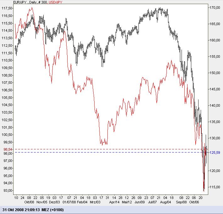 Die Nervosität der Märkte bzw. das Ausmaß des "Deleveraging" der Hedgefonds (Abbau massiver Hebelpositionen, u. a. in Rohstoffen, die mit Yen-Beleihung finanziert waren) lässt sich u. a. in signifikanter Schwäche in den Währungspaaren EUR/JPY, USD/JPY, EUR/CHF, USD/CHF ablesen. Auch die relative Stärke des Dollars, der von EUR/USD 1,60 auf 1,23 im Tief erholte, ist auch das Deleveraging zurückzuführen, da neben dem Yen der Dollar die stärkste Verschuldungswährung für die Trades war.