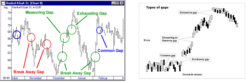"..A gap is defined as an unfilled space or interval. On a technical analysis chart, a gap represents an area where no trading takes place. On the Japanese candlestick chart, a window is interpreted as a gap. In an upward trend, a gap is produced when the highest price of one day is lower than the lowest price of the following day. Thus, in a downward trend, a gap occurs when the lowest price of any one day is higher than the highest price of the next day...."