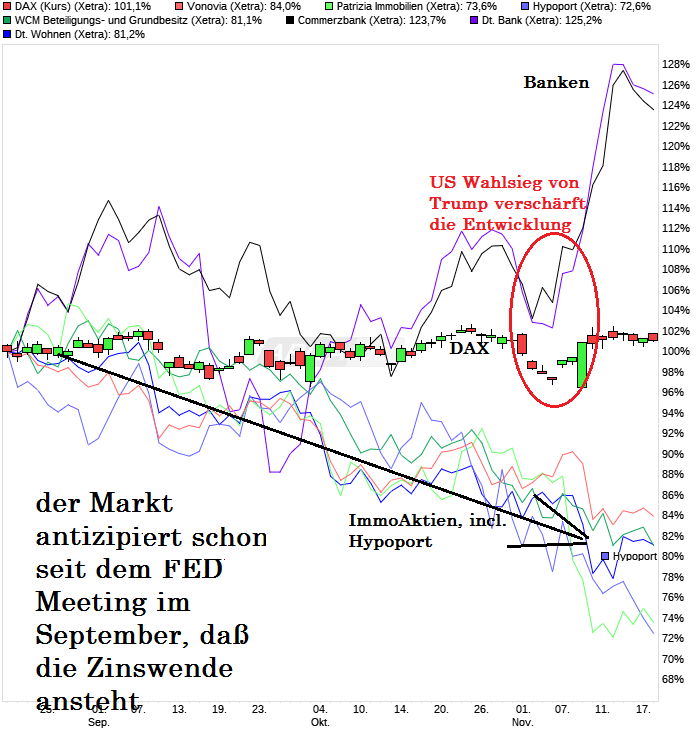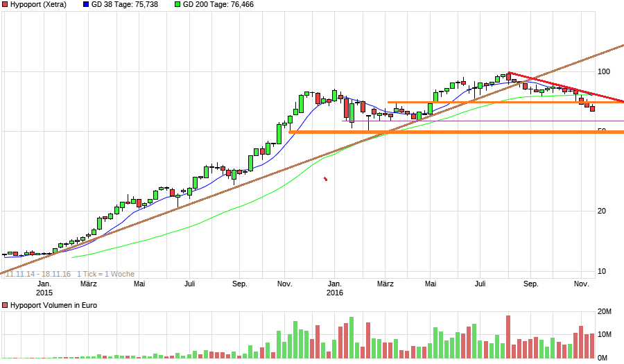 Das sind für mich die drei wahrscheinlichsten Gründe wieso Hypoport derzeit unter Druck ist und zumindest nach Chartlage auch noch unter Druck bleiben könnte. window dressing wird sich auch erst frühestens Anfang Dezember geben. Ob die Zinsängste weiter erhalten bleiben, wird davon abhängen, ob Hypoport die Angst dem Markt weiter nehmen kann. Das Problem dürfte aber eher sein, dass zwar die meisten Hypoport-Aktionäre wissen, dass das Blödsinn ist, aber sie denken, die anderen Aktionäre werden trotzdem verkaufen, und deshalb verkaufen sie zuerst. Das ist immer so ein psychologischer Teufelskreis. Und so ergeben sich auch charttechnische Abwärtstrends. Das ist auch der Hauptgrund, wieso ich Chartanalyse beachte, weil es letztlich nichts anderes ist als die graphische Darstellung von Fakten in Verbindung mit Psychologie.