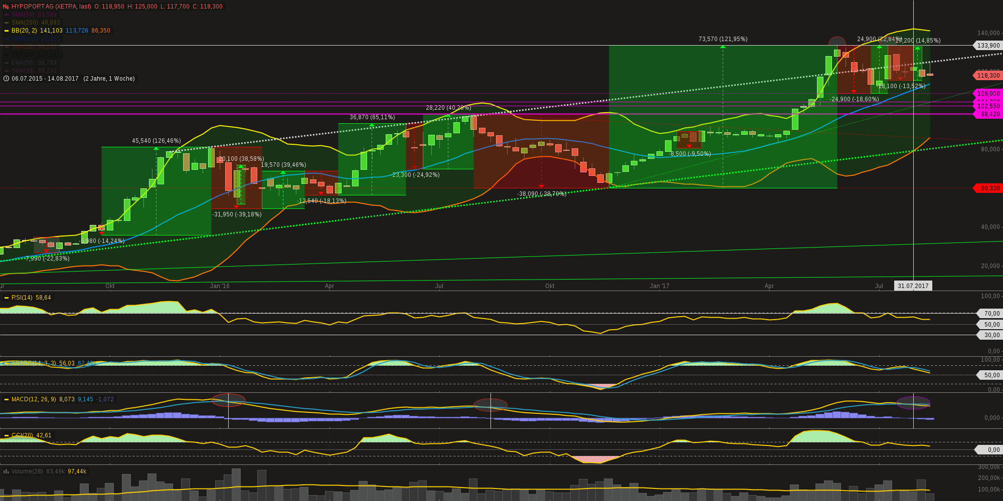 Mein Körbchen steht schon eine ganze Weile bei 105,- (offenes Gap) bereit. Die Hoffnung, daß es noch gefüllt wird, habe ich schon beinahe aufgegeben. Aber die bisherige Erfahrung mit Hypoport sagt mir, daß es durchaus noch drin ist bei der Volatilität der Vergangenheit. Und zur Sicherheit stelle ich bei der nächsten großen Unterstützung bei 110,- auch noch eins auf.