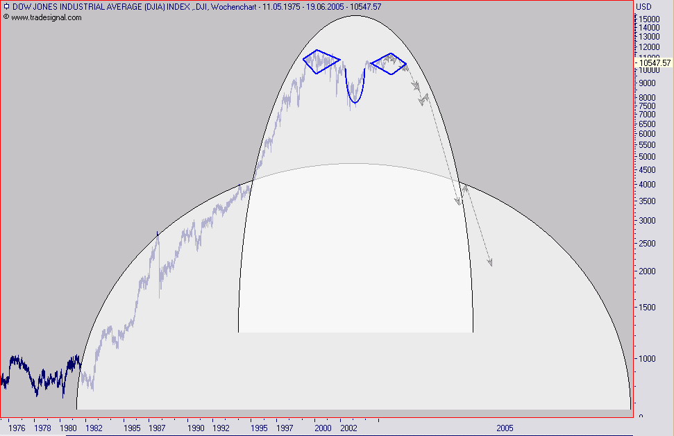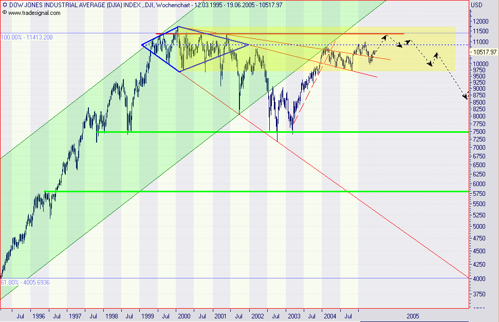 Von 1999 bis 2000 bildete er eine klasiche umkehrformation aus, danach folgte das, was bisher als "MilleniumCrash" bezeichnet wird. Dabei ist zu beachten, dass nicht etwa der Terrorakt vom 11.09.2001 zum Bruch des Trends führte, sondern dieser erst im Juli 2002 erfolgte. Im Januar 2004 erfolgt der "Bounce back", seit dem: "nicht Fisch nicht Fleisch". Der DOW läuft seitwärts und ist dabei einen Lupenreinen double-top auszubilden. Sollte die Nackenlinie bei 7500 Punkte gebrochen werden, geht es ab! Eine letzte Chance auf Stabilisierung würde um die 5800 Punkte bestehen, unter dieser Marke sollten Kurse zwischen 4000 und 2100 Punkte einkalkuliert werden.