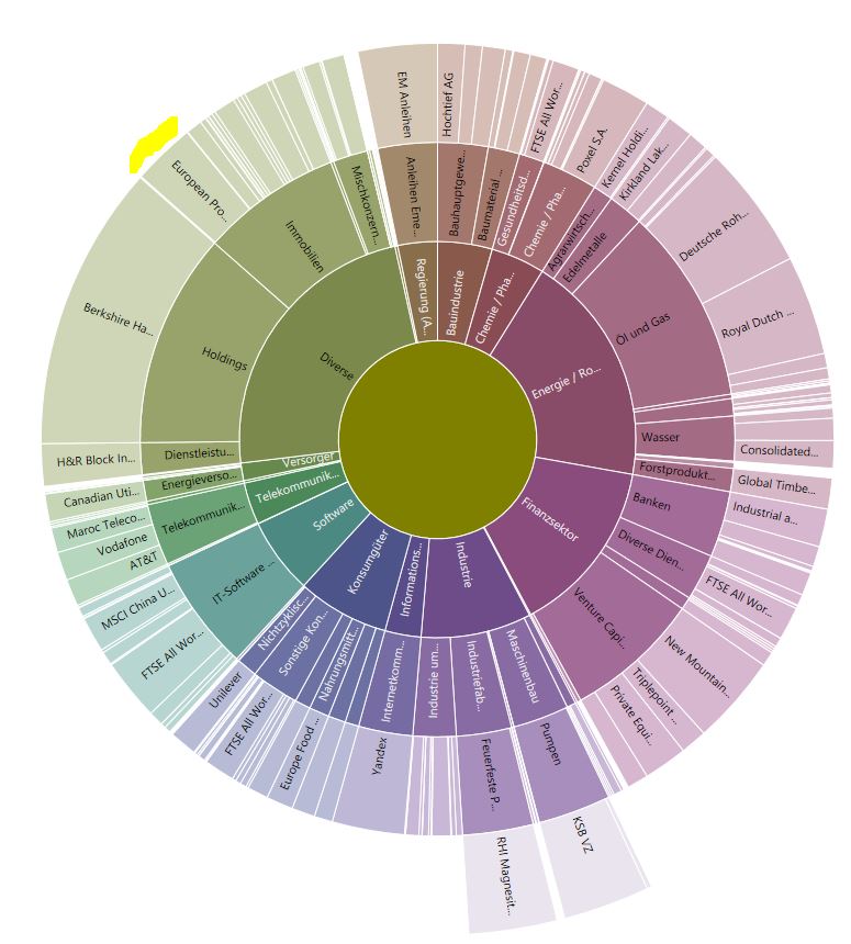 Der Einfluß des iShares European Property Yield UCITS ETF auf die Branchenverteilung im Depot ist auf der nachstehenden Grafik gelb markiert.