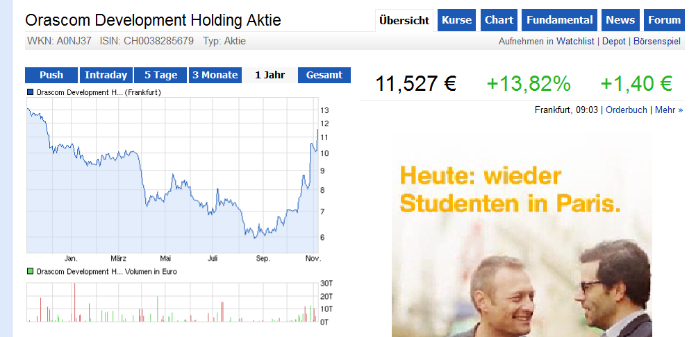 "Im ersten Quartal des laufenden Jahres hat Orascom erstmals seit der ägyptischen Revolution wieder einen Gewinn realisieren können. Grund dafür war neben einer Belebung im Segment Immobilien und Bau auch die massive Einsparung von Kosten."