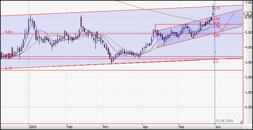 Wo die Reis hier hingeht, ist jetzt schwer zu sagen, da die obere Trendlinie erreicht wurde. Alles ist möglich! Allerdings sollte man auch die Übergeordneten Trends im Auge haben. Einige Aktien haben schon ihre Hochpunkte erreicht, so dass ich meine, man sollte sich mit dem freuen, was man hat und sich für die nächste Zeit erst mal in die Sonne legen. Dann, wenns wieder kühler wird (so im Oktober 2009) und die fallenden Meser ihre (vorläufigen) Böden erreicht haben, kann man mal wieder reinschauen und mit viel Freude neues "Aufbau"-potential vorfinden. Jedenfalls meine Meinung. Seid ab jetzt vorsichtig.