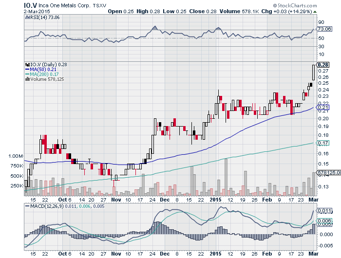 On February 18, 2015 Inca One announced an agreement to purchase 400 tonnes per month of ore with an anticipated grade of 30 grams per tonne gold from an additional mine in Peru. The company also closed a $500,000 financing to fund the purchase of mill feed materials for its Chala Plant. The financing was arranged by SC Strategy.