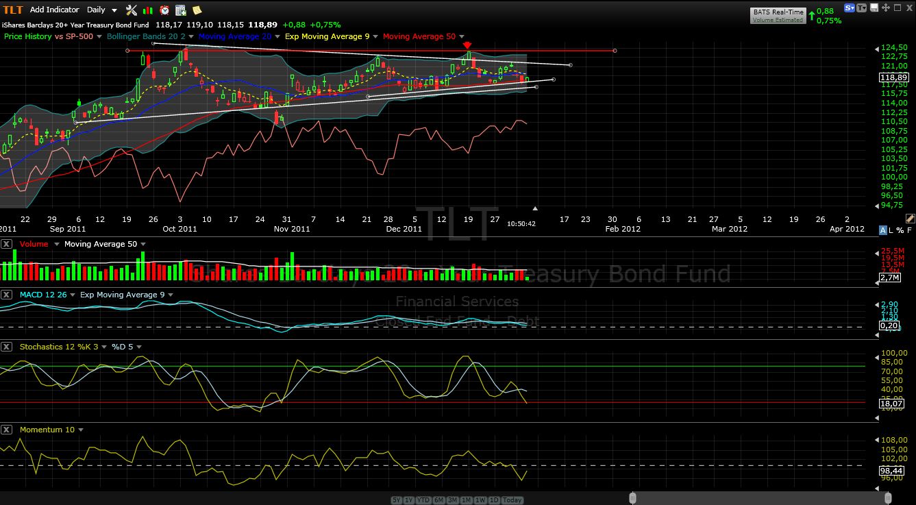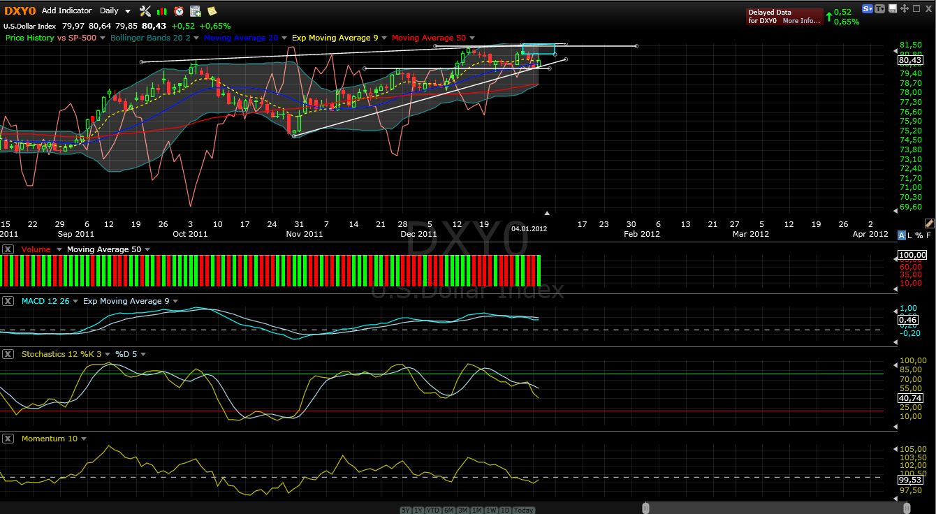 Der flache Rallytrend aus September 2011 ist noch intakt. Aktuell ziehen sich die BB zusammen, so dass eine größere Bewegung bald im Raum steht. Der Dax notiert zum Jahresschluss knapp oberhalb des mBB sowie der EMA 50. Bei zusammengezogenen BB haben diese gleitenden Durchschnitte aber nicht diese herausragende Aussagekraft.