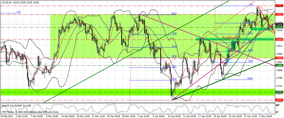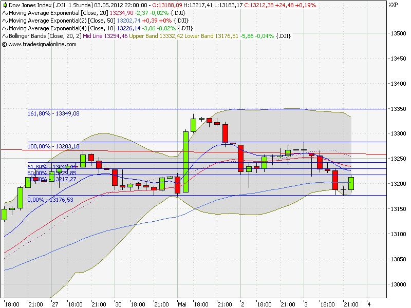 aktuell testet der DJ F die fallende EMA 9 240iger  sowie den temporär gebrochenen AUTK . Gelingt eine Rückeroberung ist damit zugleich der fallende Keil ausgelöst  und es geht mindestens zur oberen Flaggenbegrenzung bei 13222 F. Ist aber schon ein Indiz auf das mögliche Flaggeende.
