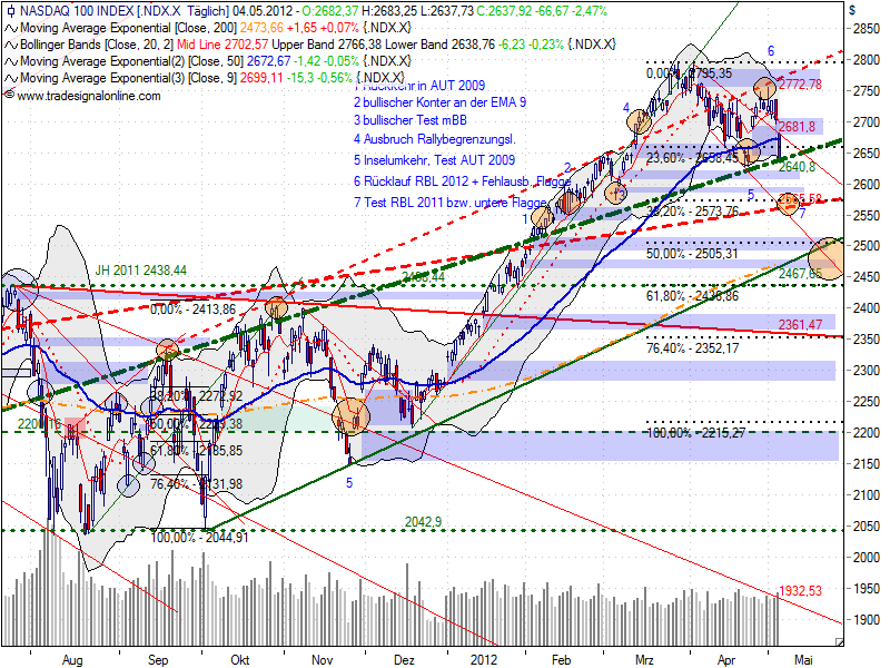 Der NDX hat erneut den maßgeblichen AUT 2009 getestet( 2640,8) liegend. Durch Das GAP riss auch die EMA 50. Es ist von einem Fehlausbruch der Flagge auszugehen.