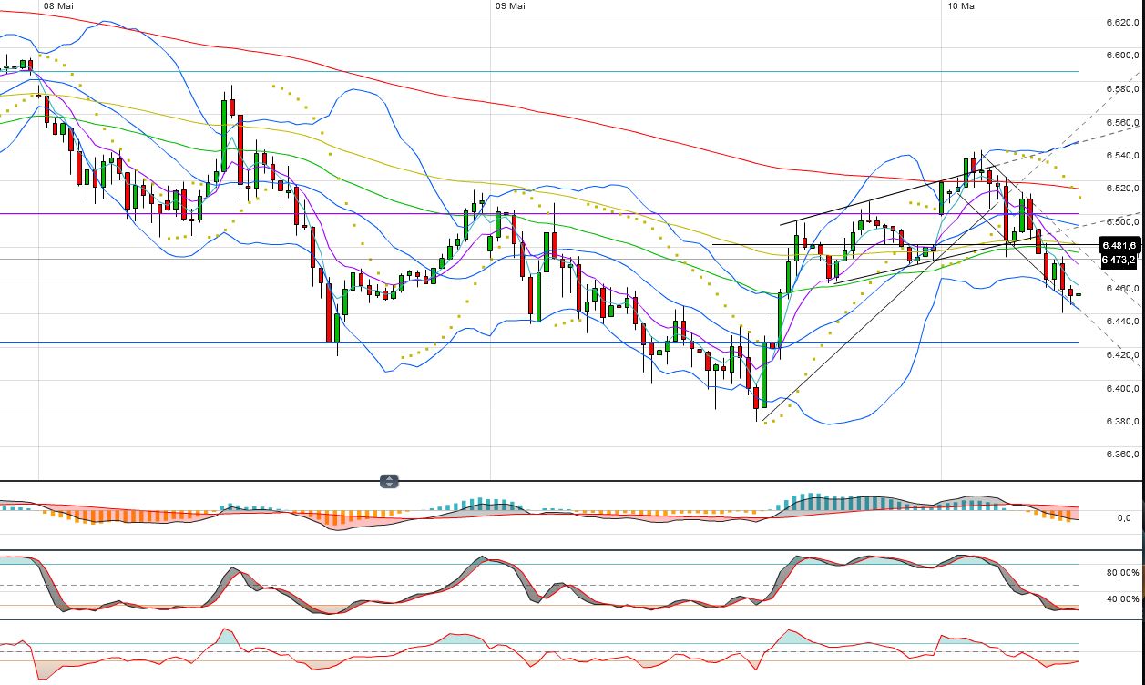 Beim erneuten Test der unteren Keilbegrenzung testet der Dax F den maßgeblichen AUAT bei 6350 F.