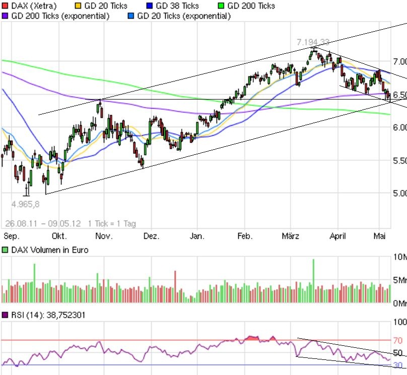 Auf dem derzeitigen Niveau könnte es also nochmals einen tiefen Rücksetzer an die untere Keilbegrenzung bei aktuell 12671 F geben, was die Schaukelbörse der vergangenen Tage fortsetzen würde.