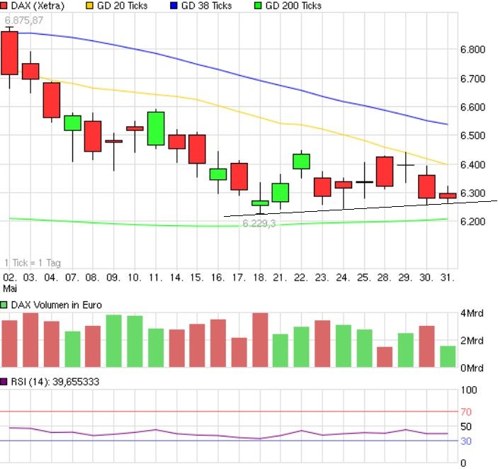 Um die Bodenbildung zu verifizieren, sollte der FDAX im heutigen Tagesverlauf keine neuen Tiefs generieren, denn ansonsten wird sich die aktuelle, volatile Seitwärtsbewegung negativ auswirken und die 6000er Marke über kurz oder lang major Taret sein.