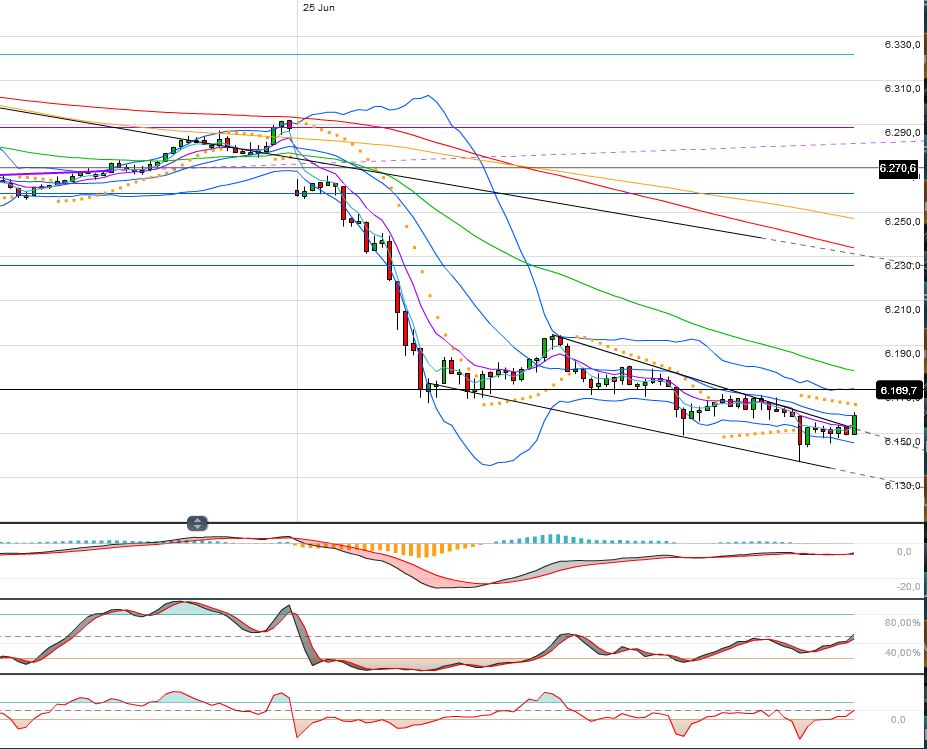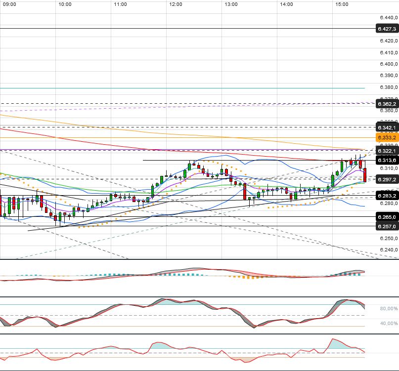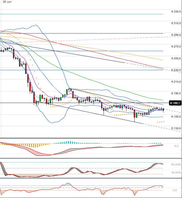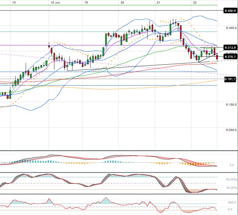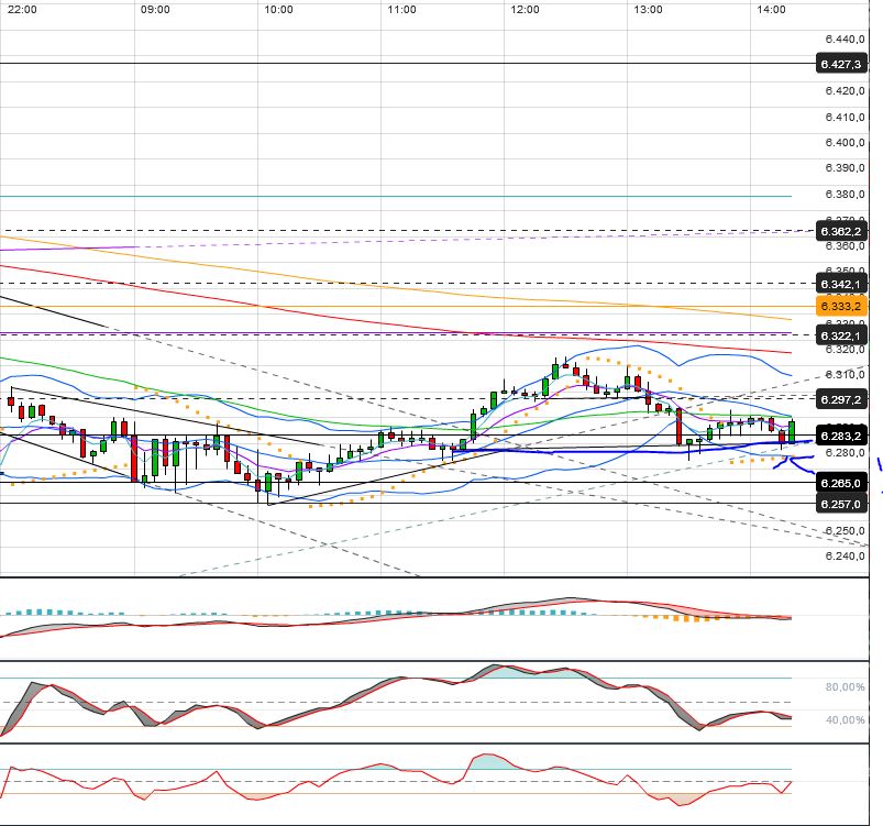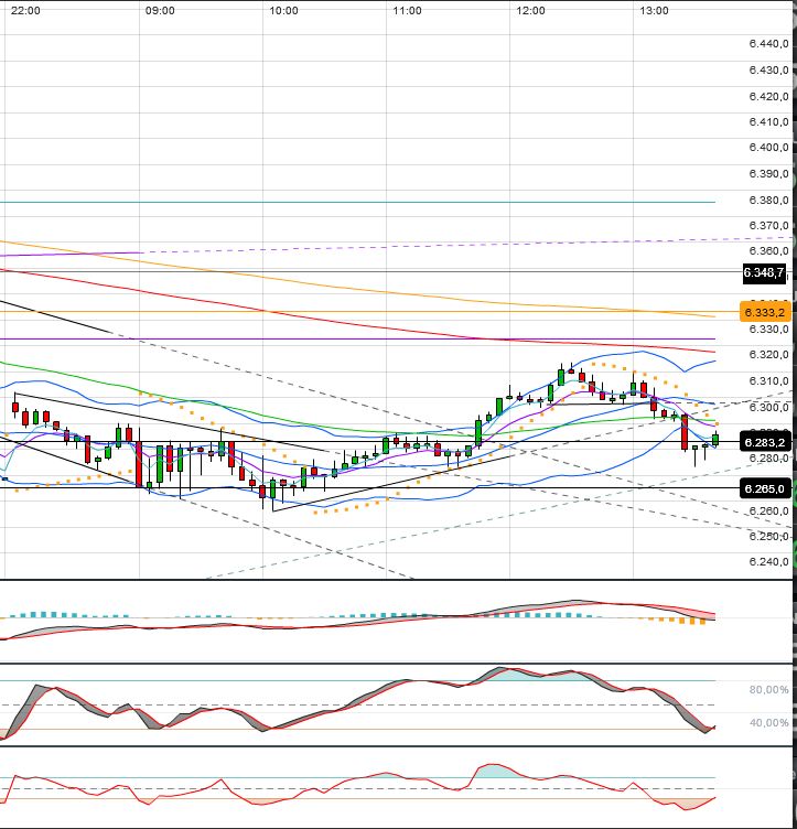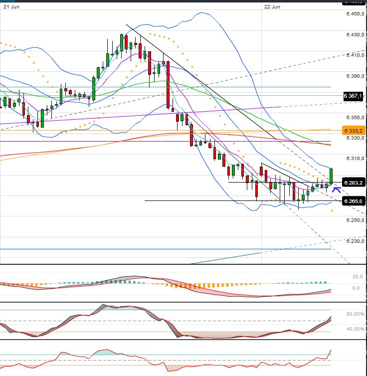 Oberhalb der 6338 F fällt mir nur das 62iger bei 6360 F ein. Darüber stünde ein Rücklauf an den gebrochenen kurzfristigen AUT an, bei aktuell hohen 6410 F. Das kann ich mir beim besten Willen nicht vorstellen.