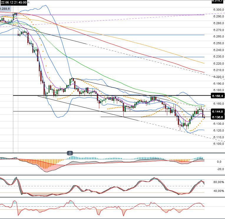 TH waren 6525F. Den gesamten Tag verharrt der Dax F seither in einer engen Spanne und testete eben bei 6465 F erneut die EMA 9. „Nur“ MUSS man sagen, da der DJ F jetzt anfangs sogar etwas konsolidiert und -0,6 % nachgibt. Gemessen an diesen Stand müsste der Dax F auf den Freitagsstand bezogen unter 6400 notieren.