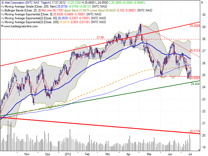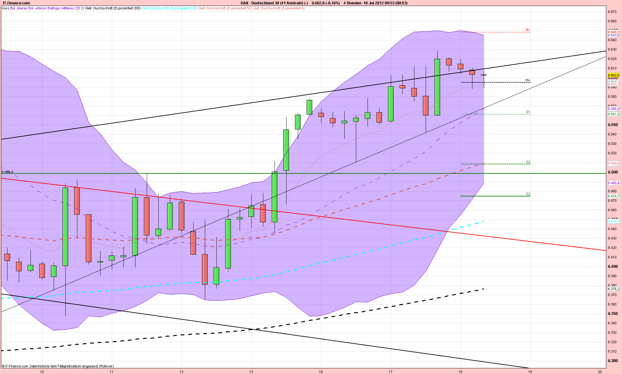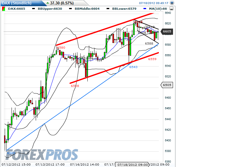 Weitere Bestätigung fände der short, wenn dabei das heutige Tagestief bei 6.560 unterschritten werden könnte und somit ein tieferes Tief entstünde.