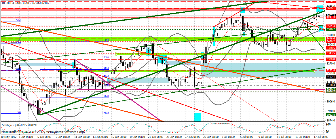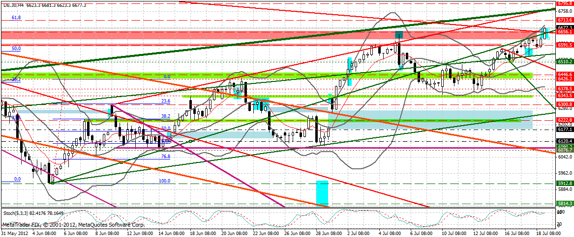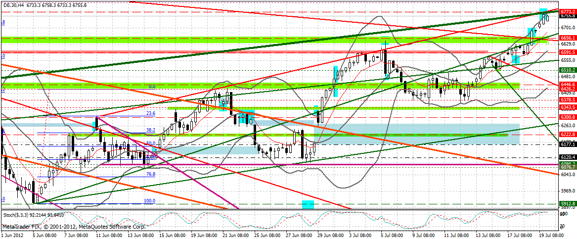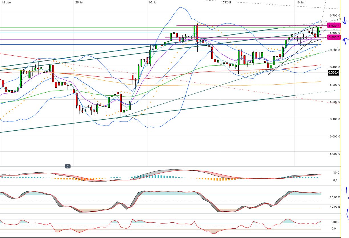Aus dem 240er betrachtet bremst momentan neben der Aufwärtstrendlinie auch der HRes am letzten markanten Hoch bei 6.630 Punkten.