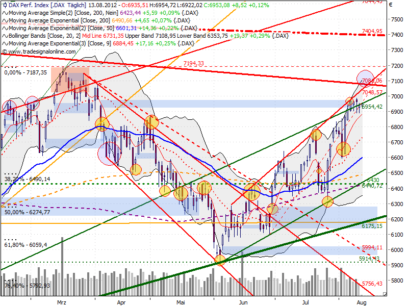 Sollte die EMA 9, bei aktuell 6884 brechen, dürfte es bis zum ansteigenden mBB runtergehen. Von hier sollte der Kurs wieder ansteigen. Diese Aussage gilt aber nur, solange zuvor der maßgebliche ABT bei 7081 noch nicht angelaufen wurde. Nach Abprall an einer markanten ABTL muss man stets wachsam sein. Hier könnte auch eine Trendwende eingeleitet werden,