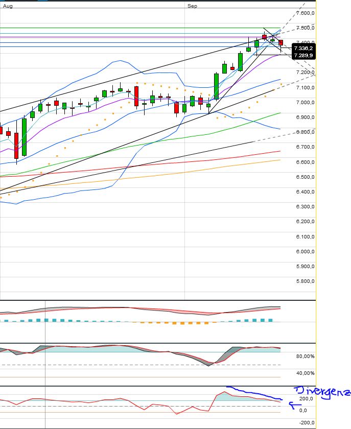 Nur falls der DJ F heute tatsächlich bis 13395/22 F abtauchen würde, wären die 7279 F im Dax F als Longchance in Gefahr.