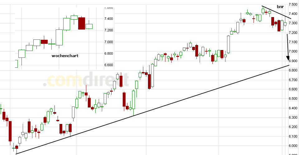 Sollte es sich bei der vorliegenden oft beachteten Formation um ein Dreieck handeln, dürfte sich das gestrige Abtauchen darunter als Fehlausbruch entpuppt haben, was in der Regel einen Ausbruch in die entgegengesetzte Richtung bedeutet.