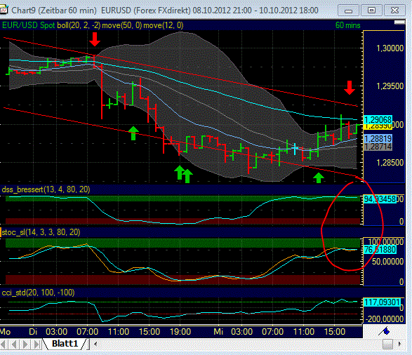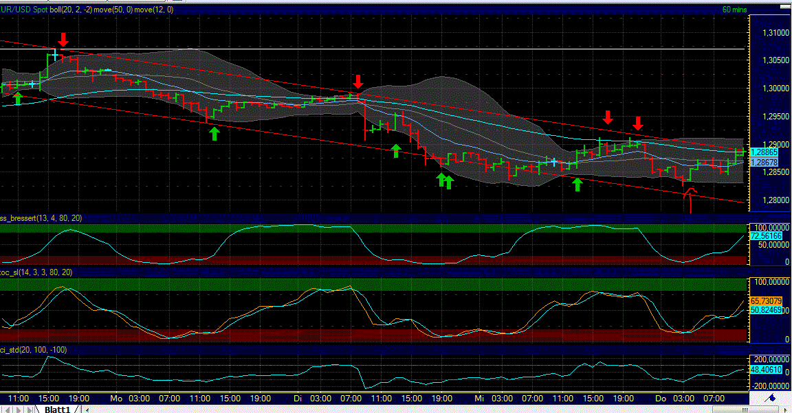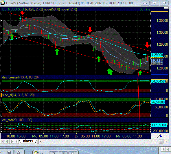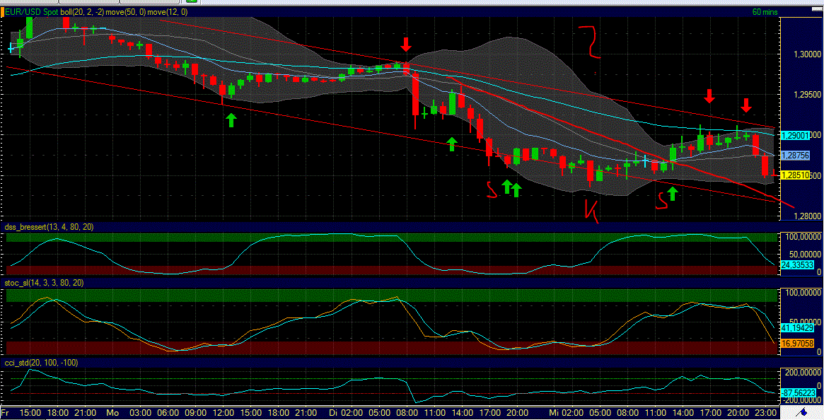 Habe ich diese Woche noch nicht besprochen. Da hadere ich noch mit meinem Pech, dass der Euro vergangenen Freitag wegen 2PIPS mein Verkaufslimit nicht ausgeführt hatte und anschließend abwärts tauchte. Die Währungen drehen sich halt sehr schnell. Zum Wochnschluss notierte er noch über der EMA 9 240iger. Zum Wochenstart rauschte er nach unten weg und löste durch den kurzfristigen Trendbruch bei 1,2973 ein Verkaufssignal aus, welches sich später mit Bruch des ausgelösten steigenden Dreieck sprich der HU 1,296 bestätigte.