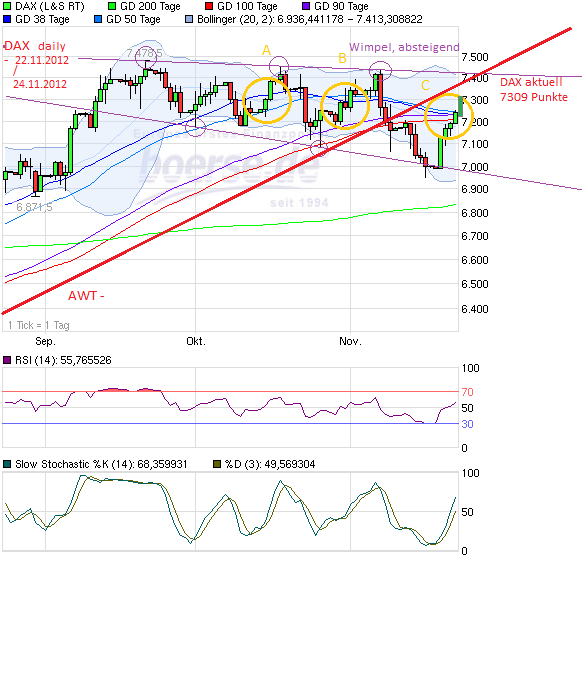 Der DAx überwand sein GD- Bundel wie oben bereits beschrieben, im "Schwung" und nähert sich der Oberkante des absteigenden Wimpsls bei 7400 +.Darüber würde sich sogar eine mögliche Rückkehr OBERHALB des rot eingezeichneten Aufwärtstrends (AWT) ermöglichen....