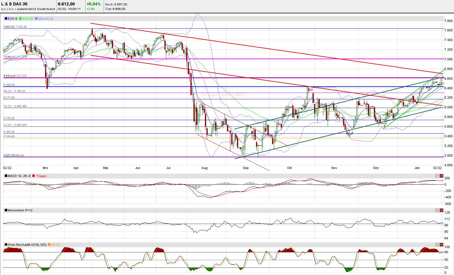 Sollte er sich weiter an der oberen Linie des mittelfristigen Aufwärtstrendes entlanghangeln  bzw. bei 6530 wieder nach oben abprallen , könnte er in etwa 10 tagen die 6700 Marke erreichen, wo dann weitere Widerstände lägen.